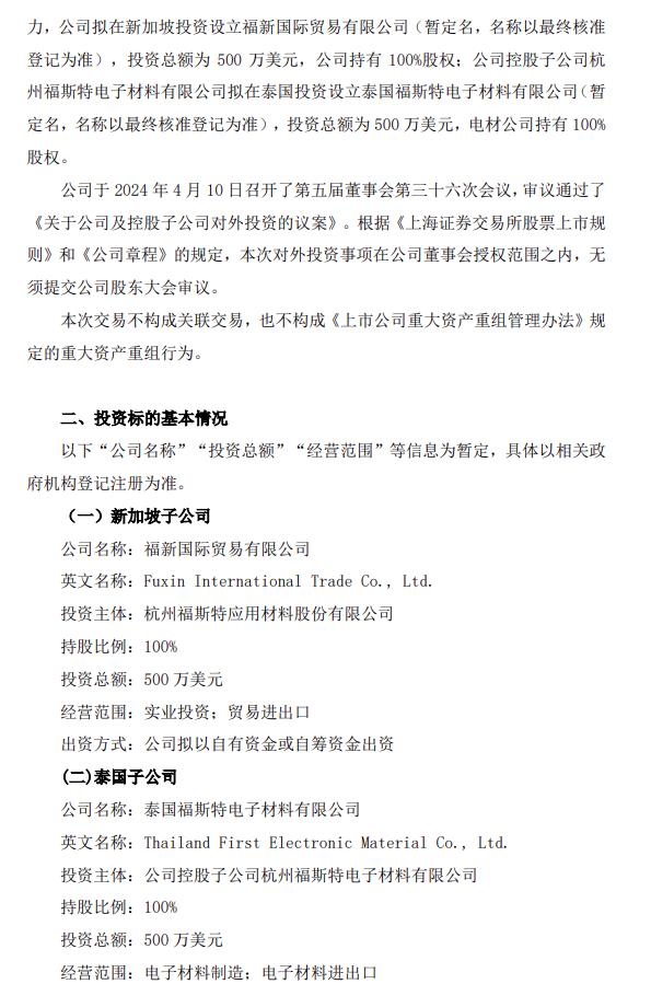 北極星太陽(yáng)能光伏網(wǎng)獲悉,4月12日,福斯特發(fā)布公告稱(chēng),公司擬在新加坡投資設立福新國際貿易有限公司,投資總額500萬(wàn)美元,公司持有100%股權;同時(shí),公司控股子公司杭州福斯特電子材料有限公司擬在泰國投資設立泰國福斯特電子材料有限公司,投資總額500萬(wàn)美元,電材公司持有100%股權。