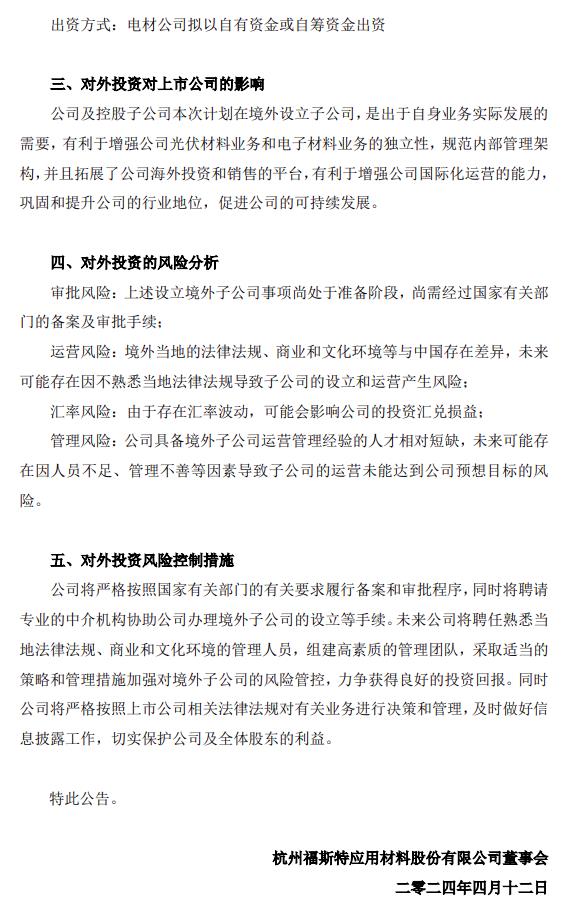 福斯特表示,公司及控股子公司本次計劃在境外設立子公司,是出于自身業(yè)務(wù)實(shí)際發(fā)展的需要,有利于增強公司光伏材料業(yè)務(wù)和電子材料業(yè)務(wù)的獨立性,規范內部管理架構,并且拓展了公司海外投資和銷(xiāo)售的平臺,有利于增強公司國際化運營(yíng)的能力,鞏固和提升公司的行業(yè)地位,促進(jìn)公司的可持續發(fā)展。