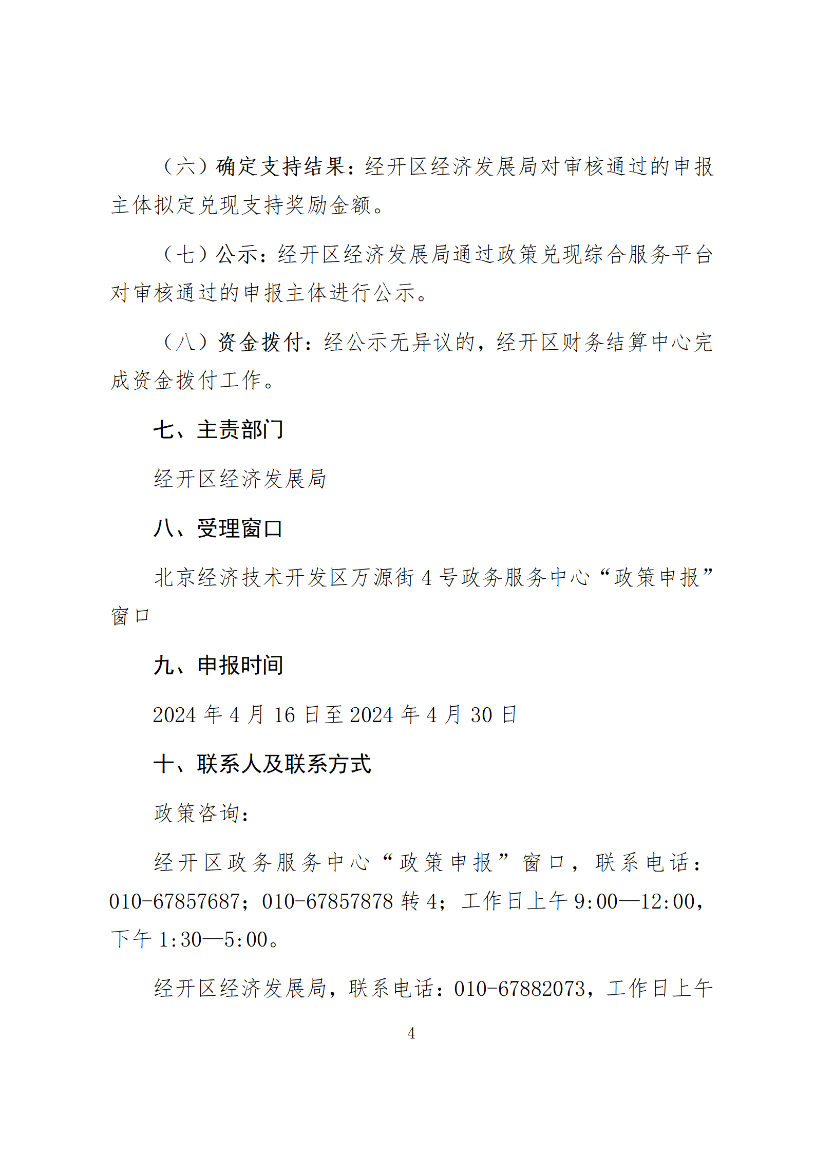 經(jīng)開(kāi)區政務(wù)服務(wù)中心“政策申報”窗口,聯(lián)系電話(huà):010-67857687;010-67857878轉4,工作日上午9:00—12:00,下午1:30—5:00。