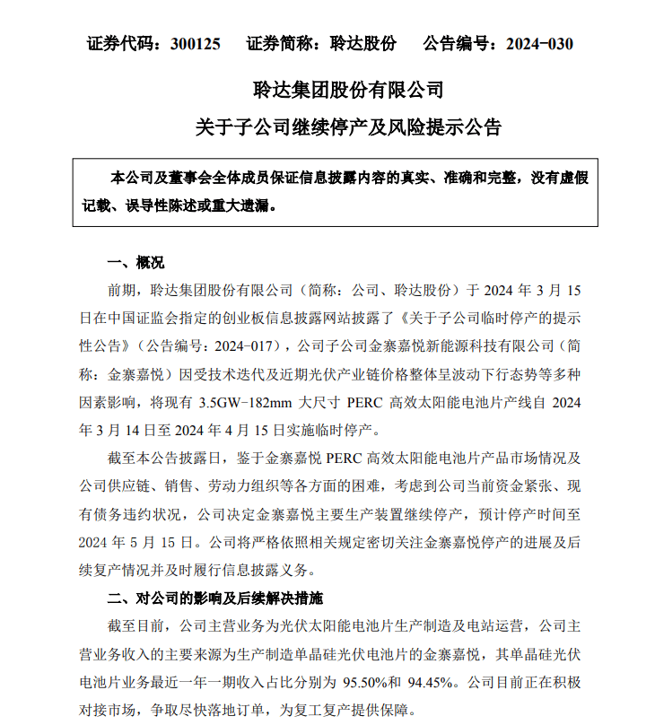 4月15日,聆達股份發(fā)布公告,截至本公告披露日,鑒于公司控股子公司金寨嘉悅新能源科技有限公司PERC高效太陽(yáng)能電池片產(chǎn)品市場(chǎng)情況及公司供應鏈、銷(xiāo)售、勞動(dòng)力組織等各方面的困難,考慮到公司當前資金緊張、現有債務(wù)違約狀況,公司決定金寨嘉悅主要生產(chǎn)裝置繼續停產(chǎn),預計停產(chǎn)時(shí)間至2024年5月15日。