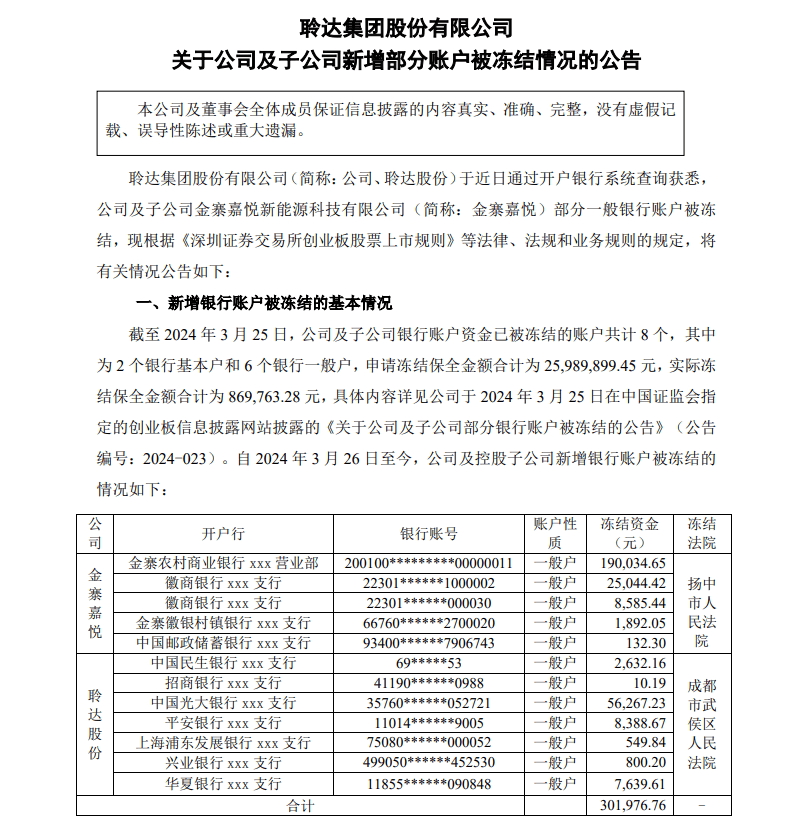 時(shí)間回溯到3月25日,聆達股份公告稱(chēng),近日通過(guò)開(kāi)戶(hù)銀行系統查詢(xún)獲悉,公司及子公司金寨嘉悅新能源科技有限公司部分銀行賬戶(hù)被凍結。公告中顯示,金寨嘉悅共有7個(gè)賬號被凍結,凍結資金共約78.3萬(wàn)元,凍結法院為宜興市人民法院;聆達股份被凍結約8.69萬(wàn)元,凍結法院為青島市市南區法院,上述兩家公司合計被凍結86.98萬(wàn)元。