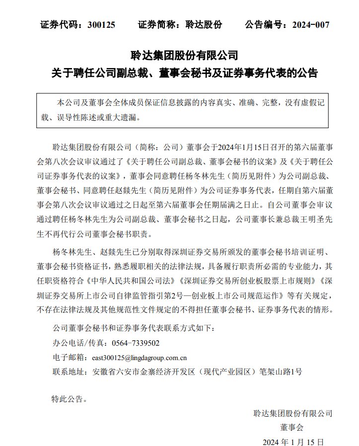 今年1月15日,聆達股份還發(fā)布了聘任楊冬林先生為公司副總裁、董事會(huì )秘書(shū)的公告。