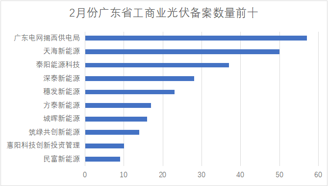 從建設單位投資數量來(lái)看:廣東電網(wǎng)有限責任公司揭陽(yáng)揭西供電局備案工商業(yè)項目最多,為57個(gè);清遠天海新能源科技有限公司為50個(gè);清遠市泰陽(yáng)能源科技有限公司為37個(gè)。
