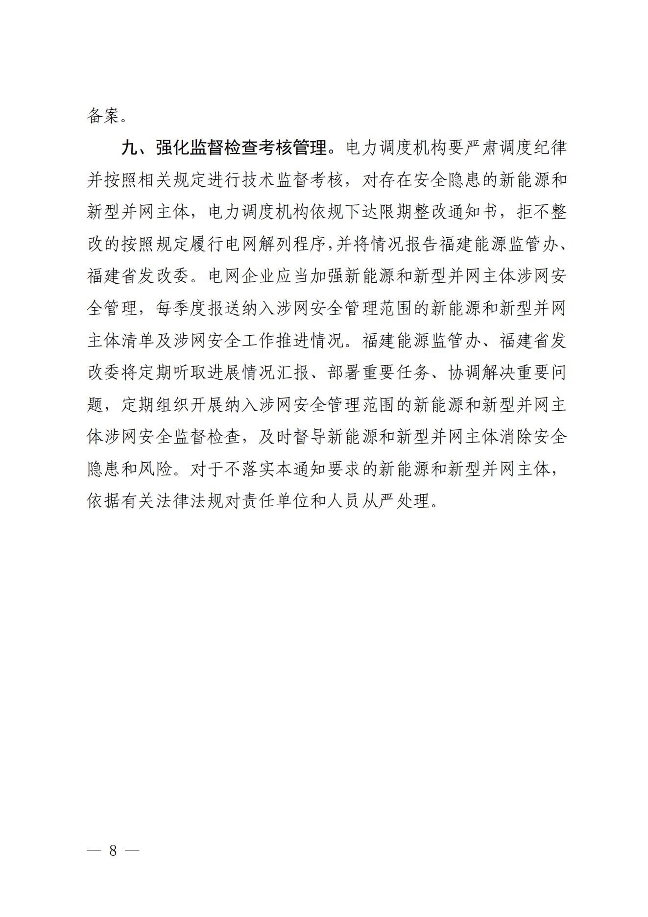 一、壓實(shí)涉網(wǎng)安全管理責任。各有關(guān)電力企業(yè)要緊扣新形勢下能源轉型和電力保供目標,深刻認識新能源和新型并網(wǎng)主體涉網(wǎng)安全的重要性,以高度的責任感與使命感,切實(shí)強化新能源和新型并網(wǎng)主體涉網(wǎng)安全管理工作;電力調度機構應按照國家有關(guān)法律及技術(shù)標準的要求,明確相關(guān)并網(wǎng)要求和管理流程,制定相關(guān)調度運行管理流程,加強新能源和新型并網(wǎng)主體調度管理,做好涉網(wǎng)二次系統的技術(shù)監督工作;電網(wǎng)企業(yè)要加強電網(wǎng)安全風(fēng)險管控,為并網(wǎng)主體安全并網(wǎng)提供保障??茖W(xué)界定涉網(wǎng)安全管理范圍,將所有新能源和新型并網(wǎng)主體納入涉網(wǎng)安全管理范圍,根據新能源和新型主體并網(wǎng)的類(lèi)型、容量規模、接入電壓等級、系統運行特性等提出相應涉網(wǎng)管理要求;納入涉網(wǎng)安全管理范圍的新能源和新型并網(wǎng)主體的業(yè)主單位要嚴格履行安全主體責任,接受電力調度機構統 一調度,嚴格執行涉網(wǎng)安全管理的各項規章制度。福建能源監管辦、福建省發(fā)改委及地方各級政府電力主管部門(mén)依職責做好新能源和并網(wǎng)主體的相關(guān)工作。