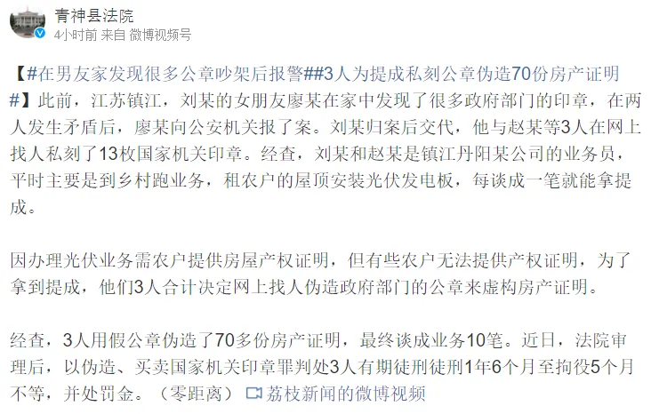 據劉某歸案后交代,他與鎮江丹陽(yáng)某公司的業(yè)務(wù)員趙某和劉某,平時(shí)主要是到鄉村跑業(yè)務(wù),租農戶(hù)的屋頂安裝光伏發(fā)電板,每談成一筆就能拿提成。因辦理光伏業(yè)務(wù)需農戶(hù)提供房屋產(chǎn)權證明,但有些農戶(hù)無(wú)法提供,為了拿到提成,3人在網(wǎng)上找人私刻了13枚國家機關(guān)印章,偽造政府部門(mén)的公章來(lái)虛構房產(chǎn)證明。更魔幻的是,他們已用假證偽造了70多份房產(chǎn)證明,并談成10筆真業(yè)務(wù)。