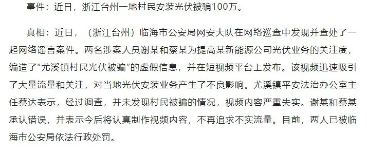 浙江臺州一則“村民安裝光伏被騙100萬(wàn)”的短視頻引發(fā)恐慌,結果警方一查,竟是某新能源公司員工自導自演,目的是為提高光伏業(yè)務(wù)的關(guān)注度,編造的虛假信息。