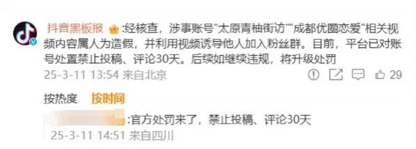 成都警方于3月13日發(fā)布通報稱(chēng),上述相親視頻系擺拍,涉案6人已被警方行政拘留,案件正在進(jìn)一步偵辦中。目前,抖音平臺已對涉事賬號賬號處置禁止投稿、評論30天。后續如繼續違規,將升級處罰。
